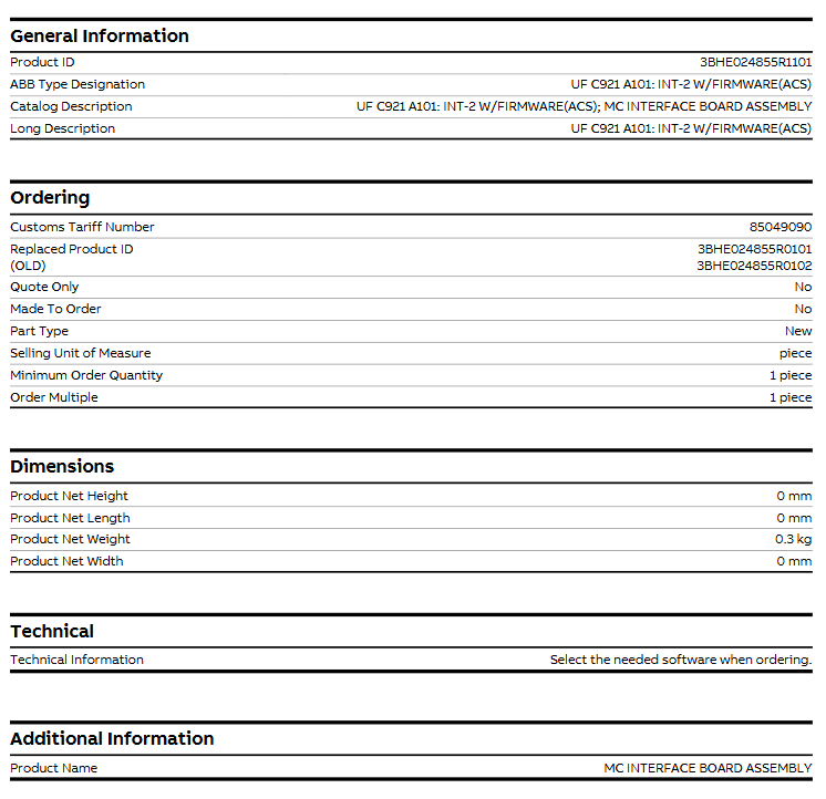 ABB UFC921A101 เป็นส่วนประกอบแผงวงจรอินเทอร์เฟซ MC ประเภท INT-2 ที่บูรณาการโดยเฉพาะ ออกแบบและผลิตโดย ABB สำหรับกลุ่มผลิตภัณฑ์ไดรฟ์อุตสาหกรรมและระบบอัตโนมัติ 3BHE024855R0101 ไม่ใช่โมดูลอิสระที่สามารถเชื่อมต่อโดยตรงกับการเดินสายภาคสนาม แต่ทำหน้าที่เป็นระบบย่อยการทำงานหลัก ซึ่งบูรณาการอย่างลึกซึ้งภายในไดรฟ์หรืออุปกรณ์ควบคุมที่ซับซ้อนกว่าของ ABB ภารกิจหลักคือการทำหน้าที่เป็นตัวควบคุมหลัก โดยจัดให้มีการแลกเปลี่ยนข้อมูล การส่งคำสั่ง และการซิงโครไนซ์สถานะด้วยความเร็วสูงและเชื่อถือได้ เฟิร์มแวร์ออนบอร์ดคือที่ที่ข้อมูลอัจฉริยะอยู่ ช่วยให้มั่นใจได้ถึงการสื่อสารที่ราบรื่นกับระบบโฮสต์และการทำงานร่วมกันที่มีประสิทธิภาพ