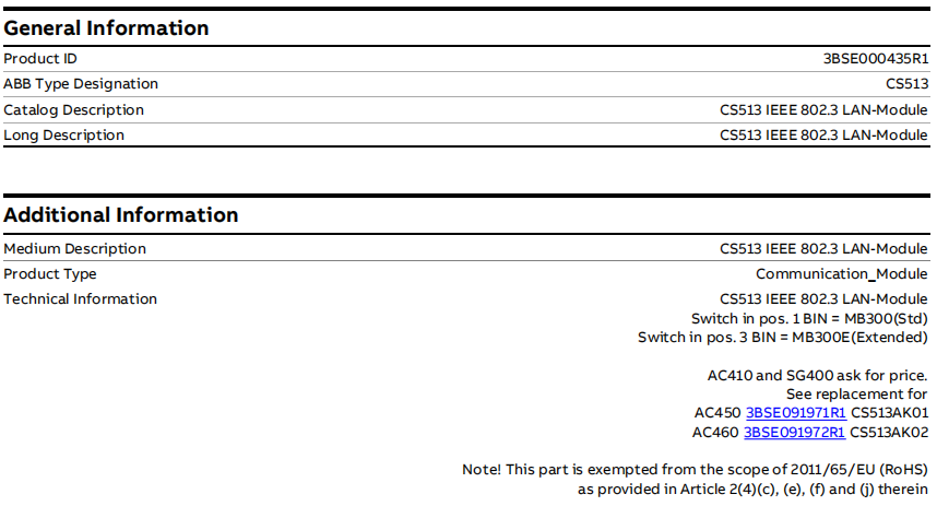 CS513 เป็นองค์ประกอบการสื่อสารผ่านเครือข่ายที่สำคัญในระบบควบคุมกระบวนการแบบกระจายของ ABB Advant Master 3BSE000435R1 ถูกกำหนดให้เป็นโมดูล LAN IEEE 802.3 หน้าที่หลักของมันคือการจัดหาอินเทอร์เฟซการสื่อสารอีเทอร์เน็ตมาตรฐานสำหรับคอนโทรลเลอร์ซีรีส์ Advant Controller 410/450 ช่วยให้สามารถเข้าถึงเครือข่ายท้องถิ่นระดับโรงงานโดยใช้โปรโตคอล IEEE 802.3