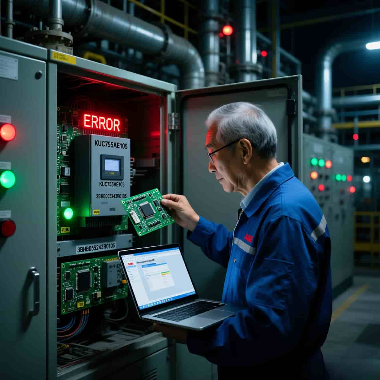 หลังจากปฏิบัติตามขั้นตอนด้านความปลอดภัยของ LOTO อย่างเคร่งครัดและยืนยันว่าระบบปิดสนิทแล้ว เสี่ยวลี่ก็เปิดตู้ควบคุม พบว่าไฟสีเขียว RUN บน KUC755AE105 ไม่ได้เปิดอยู่ ขณะที่ไฟสีแดง ERRO กระพริบ จากประสบการณ์หลายปีของเขา เขาตัดสินว่ามีความล้มเหลวในชิปการสื่อสารหรือเฟิร์มแวร์ของบอร์ดควบคุมเป็นครั้งคราว