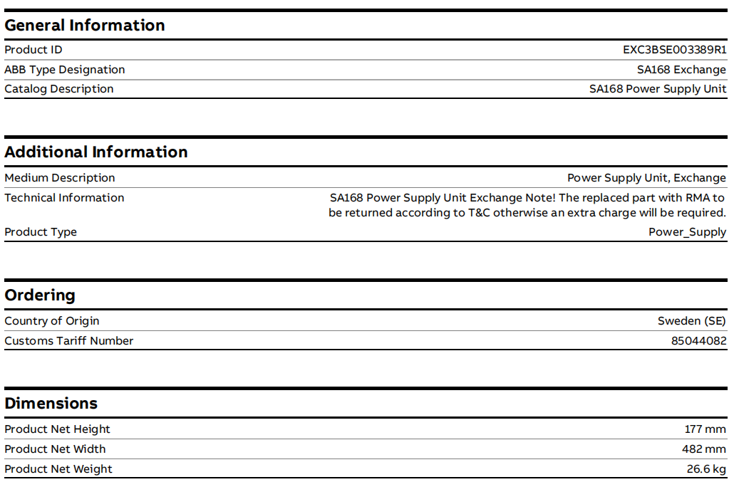 SA168 เป็นส่วนประกอบแหล่งจ่ายไฟหลักในระบบควบคุมกระบวนการแบบกระจาย ABB Advant Master 3BSE003389R1 ได้รับการกำหนดให้เป็น "หน่วยจ่ายไฟ" ซึ่งมีหน้าที่พื้นฐานในการแปลงแหล่งจ่ายไฟหลัก AC ที่โรงงานได้รับให้เป็นแรงดันไฟฟ้าทำงาน DC ที่เสถียร บริสุทธิ์ และกระเพื่อมต่ำซึ่งโมดูลอิเล็กทรอนิกส์ทั้งหมดภายในระบบ Advant Master ต้องการ