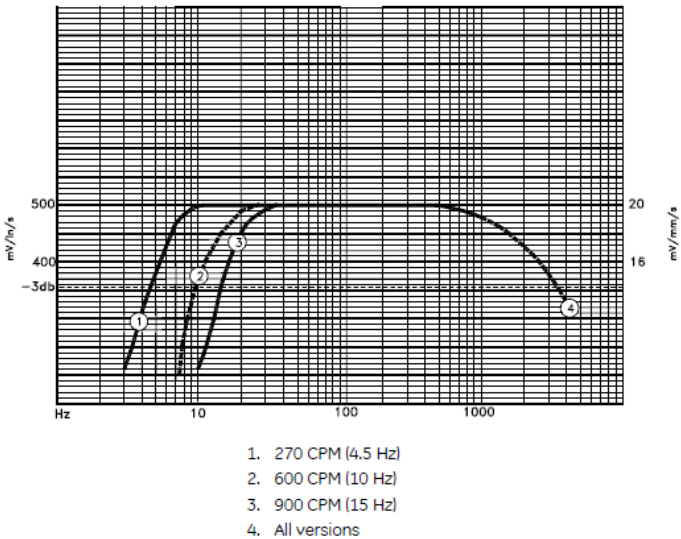 การตอบสนองความถี่: ด้วยตัวเลือก A ตั้งค่าเป็น 01 (ความถี่ขั้นต่ำ 4.5 Hz) ช่วงการตอบสนองคือ 4.5 Hz ถึง 1,000 Hz (270 ถึง 60,000 cpm), ทั่วไป± 0.3 dB