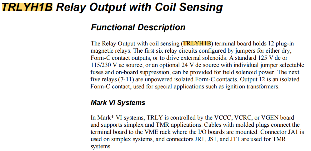 GE IS230TRLYH1BGG เป็นบอร์ดเทอร์มินัลเอาท์พุตรีเลย์ความปลอดภัยที่เชื่อถือได้สูงและมีความสามารถในการวินิจฉัยสูง ซึ่งออกแบบโดย General Electric สำหรับกังหันความปลอดภัยและระบบควบคุมกระบวนการที่ได้รับการปรับปรุงของ Mark VIeS ในฐานะองค์ประกอบด้านความปลอดภัยหลักของสถาปัตยกรรม I/O แบบกระจายของ Mark VIeS บอร์ดนี้ไม่เพียงแต่สืบทอดข้อดีทั้งหมดของเอาท์พุตรีเลย์ของระบบ Mark VIe เท่านั้น แต่ยังผ่านการปรับปรุงฮาร์ดแวร์และเฟิร์มแวร์ด้วย ทำให้สามารถสวมบทบาทเป็นเครื่องมือด้านความปลอดภัยและตรงตามข้อกำหนดของมาตรฐานความปลอดภัยในการใช้งาน IEC 61508 / IEC 61511 ตัว IS230TRLYH1BGG นั้นเป็นยูนิตอินเทอร์เฟซทางกายภาพที่ได้รับคำสั่งจากโมดูลตัวประมวลผล I/O ที่ได้รับการรับรองความปลอดภัย และขับเคลื่อนอุปกรณ์แจ้งเตือน อินเตอร์ล็อคของระบบเสริม และแม้แต่วงจรควบคุมเสริมของวาล์วเชื้อเพลิงหลักและแอคชูเอเตอร์อื่นๆ ในภาคสนามผ่านรีเลย์ความปลอดภัยแบบสัมผัสบังคับที่บูรณาการภายใน บอร์ดทำหน้าที่เป็นสะพานเชื่อมความปลอดภัยที่เชื่อมต่อตรรกะการควบคุม Mark VIeS เข้ากับโลกทางกายภาพ เพื่อให้มั่นใจว่าในสภาวะที่เป็นอันตราย ระบบสามารถเข้าสู่สถานะที่ปลอดภัยอย่างคาดการณ์และเชื่อถือได้
