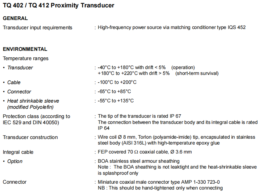 ช่วงอุณหภูมิการทำงานที่กว้างเป็นพิเศษช่วยให้ตัวเซนเซอร์ทำงานภายในช่วงอุณหภูมิ -40°C ถึง +180°C และสามารถทนต่ออุณหภูมิได้ถึง 220°C ในระยะสั้น ช่วยให้สามารถติดตั้ง Proximity Transducers ได้โดยตรงใกล้กับส่วนประกอบที่มีอุณหภูมิสูง เช่น กังหันไอน้ำและกังหันก๊าซ โดยไม่จำเป็นต้องใช้ระบบระบายความร้อนที่ซับซ้อน