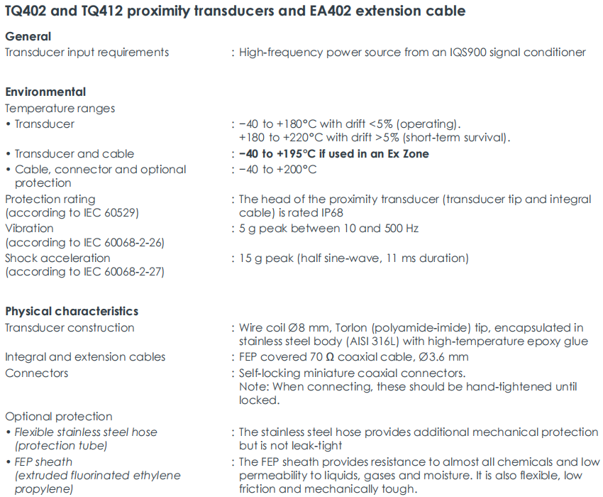 TQ412 111-412-000-013-A1-B1-E050-F2-G050-H05 เป็นเซ็นเซอร์ดิสเพลสเมนต์กระแสไหลวนแบบไม่สัมผัสประสิทธิภาพสูงที่ผลิตโดย Parker Meggitt ผลิตภัณฑ์ TQ412 อยู่ในกลุ่มผลิตภัณฑ์ระบบการวัดแบบปิด และได้รับการออกแบบมาโดยเฉพาะสำหรับการวัดการสั่นสะเทือนสัมพัทธ์และการเคลื่อนตัวตามแนวแกนของเพลากลที่กำลังหมุนในสภาพแวดล้อมทางอุตสาหกรรมที่รุนแรงอย่างแม่นยำ