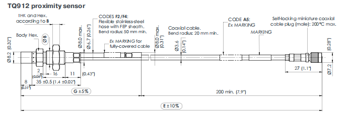 TQ912 111-912-000-01X-A1-B1-E5000-F0-G0-H05 ได้รับการออกแบบมาสำหรับแอปพลิเคชันย้อนกลับ ตัวเซ็นเซอร์มีให้เลือกทั้งแบบเมตริกหรือจักรวรรดิและมีสายเคเบิลโคแอกเซียลอินทิกรัลที่สิ้นสุดด้วยขั้วต่อโคแอกเซียลขนาดเล็กที่ล็อคด้วยตนเอง